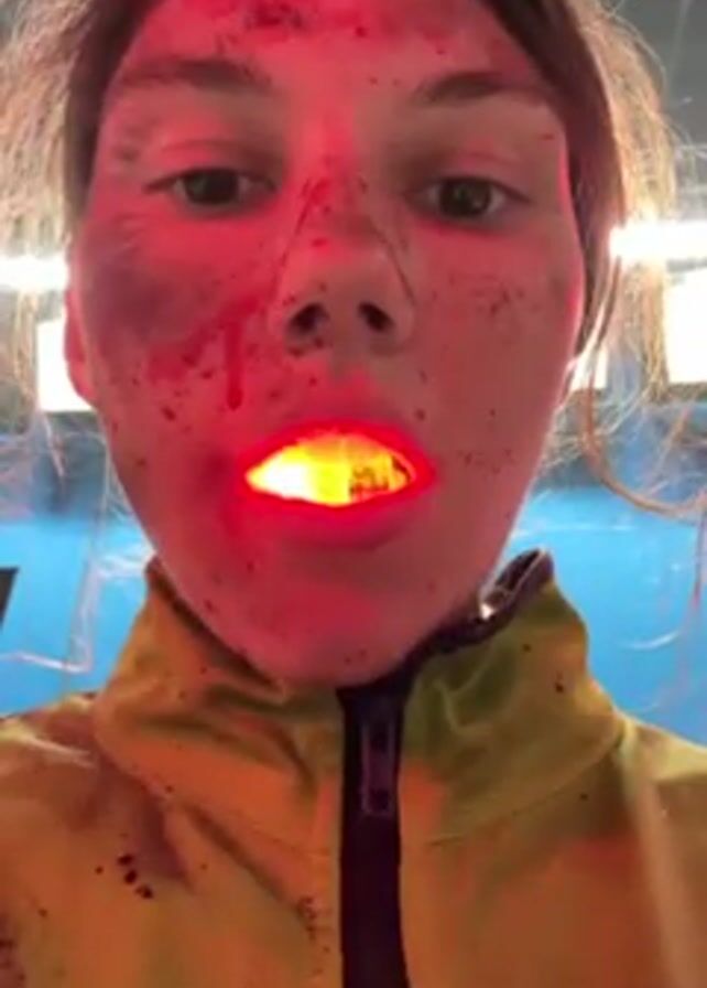 A young woman with brown hair stands indoors wearing a bright green jacket. Her face is covered with what appears to be dirt, smudges, and red liquid resembling blood. She is holding a red light inside her mouth, illuminating her open mouth and teeth. The background is out of focus but appears to be a room with blue walls and bright overhead lights.