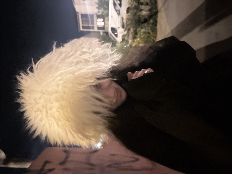 This image captures an individual at night in an urban setting within Strasbourg, France. The subject wears a voluminous, shaggy, light-colored (likely off-white or very light blonde) fur-like headpiece that covers the majority of their head and hair. Dark-toned outerwear, appearing to be a coat or sweater, is also visible. The subject's face is partially obscured by the headpiece and their right hand, which is positioned near the chest, with a ring observed on the index finger. A faint smile is discernible. The background consists of a reddish-pink wall with indistinct graffiti on the left. To the right, a multi-story building with illuminated windows is visible, along with at least two parked white commercial vans and green shrubbery. The ground in the immediate vicinity appears to be a paved surface. The scene is illuminated by ambient artificial night lighting.