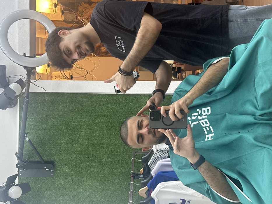 Inside a modern barbershop in Athens, Greece, two males are depicted in a selfie-style photograph