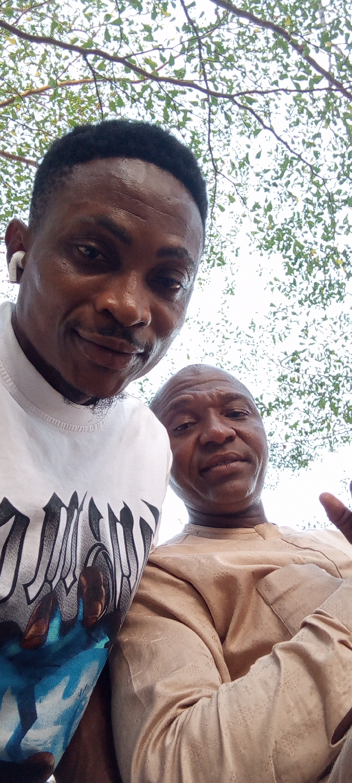 This image depicts two adult males in a close-up, upward-angled photograph, located outdoors in the city of Adankolo, Nigeria