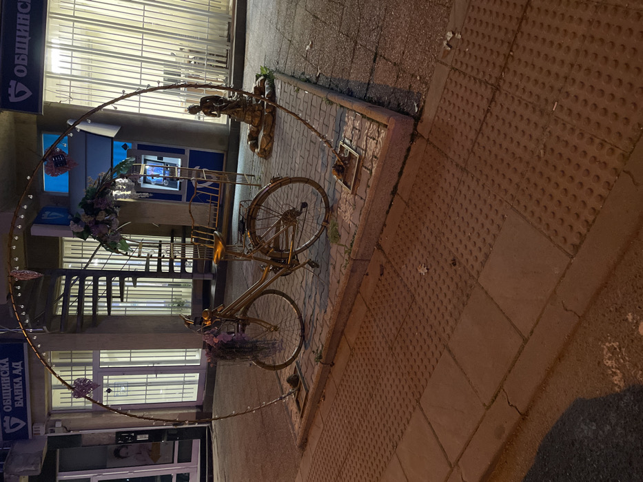 This image depicts a static urban scene at night or dusk in Dupnitsa, Bulgaria. In the foreground, a dark gray pedestrian sidewalk is visible, composed of rectangular tactile paving sections with raised dots and smooth sections. A curb separates this sidewalk from a slightly elevated, paved display area. The central subject is a decorative outdoor display situated on the elevated paved area, which features gray and white rectangular pavers. The display is predominantly golden in color and includes: - A large, upright metallic arch, decorated with small lights and some ornamental elements. - A golden-painted vintage-style bicycle, adorned with artificial purple and green floral arrangements on its handlebars and rear rack. - A small, golden-colored fountain sculpture featuring a seated mermaid-like figure. - A golden-colored metal bench with a slatted seat and backrest. - A golden-colored decorative spiral staircase structure positioned behind the bicycle. In the background, a building facade is visible, identified as "ОБЩИНСКА БАНКА АД" (Municipal Bank AD) by the blue signage. The bank building features large glass windows, some with vertical white blinds or bars. An ATM is visible in the right portion of the bank facade, illuminated by its screen. Through the windows, an interior spiral staircase can be discerned. The scene is illuminated by artificial light sources, casting some shadows. No individuals are present.