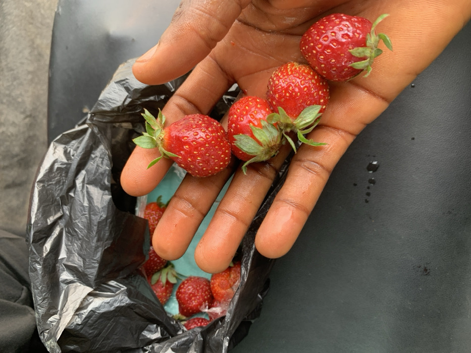 The image displays a close-up, high-angle view of a dark-skinned human hand holding five ripe red strawberries. The strawberries feature prominent green calyxes and visible achenes. Several water droplets are present on the palm and fingers of the hand, indicating the strawberries or hand may be wet. To the left and slightly behind the hand, a crinkled black plastic bag is visible, open and containing an indeterminate number of additional red strawberries. A light blue or greenish surface is visible within the bag beneath the strawberries. The hand and bag rest on a dark, smooth surface, likely black or dark grey, which also shows scattered small water droplets. The scene captures the act of handling freshly prepared or acquired strawberries. The precise location in Abuja, Nigeria, is not discernible from the visual information provided in the image.