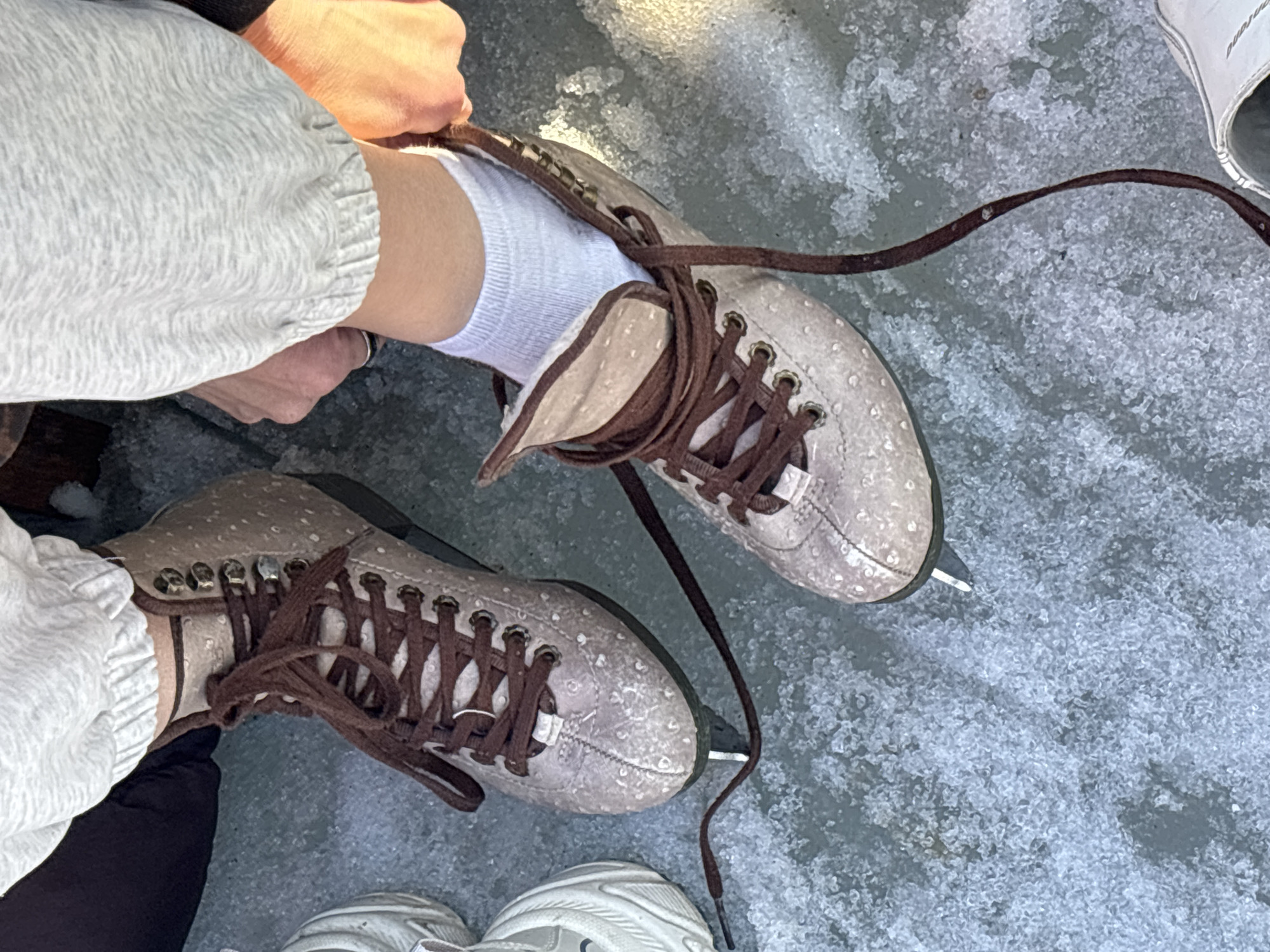 A close-up, high-angle view captures a person manipulating ice skates on an icy surface in Listvyanka, Russia. The individual wears light grey sweatpants, cinched at the ankle, and white ankle socks. Two light beige ice skates with dark brown laces are prominent. The left skate is fully laced and rests on the ice, its metal blade visible beneath the boot. To its left, a partial view of a white athletic shoe is present. The right skate is partially laced, with multiple brown laces loose and trailing on the ice. A right hand, exhibiting an orange tint from ambient light, is pulling the upper edge of the right skate boot, where the person's white-socked foot is inserted. A dark garment is visible near the left leg. The ground consists of clear ice overlaid with scattered fragments of crystalline snow or crushed ice, indicating a cold, outdoor environment.