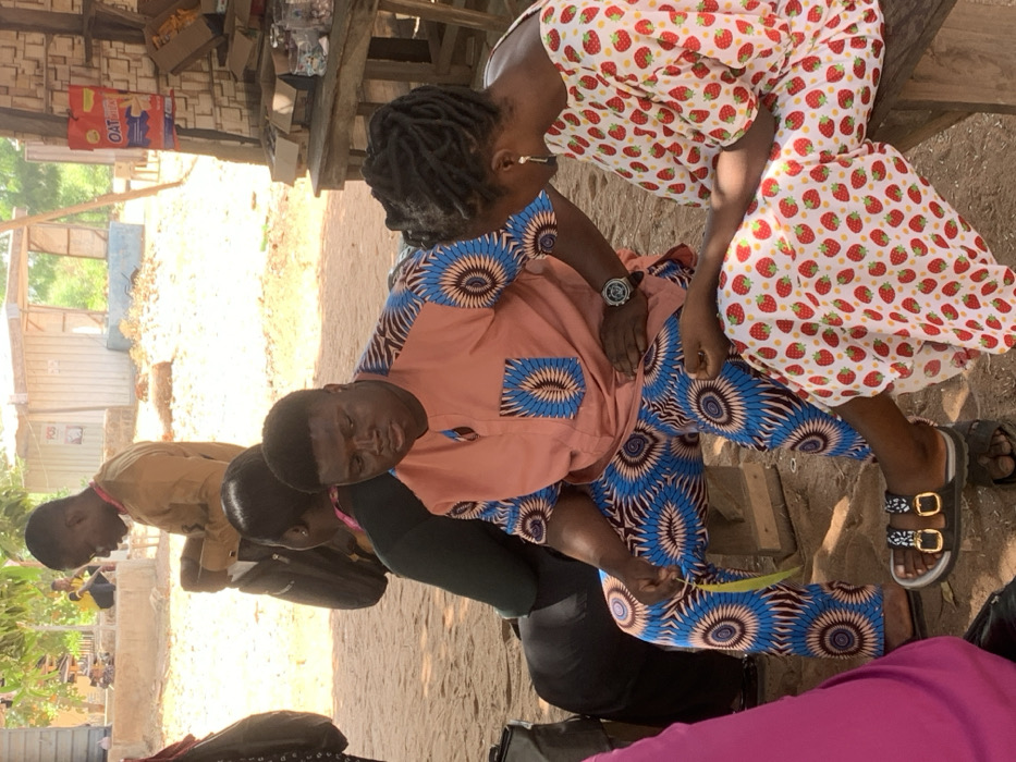 The image depicts an outdoor scene in Apata Yakuba, Nigeria, featuring several individuals and an informal market-like setting under daylight conditions