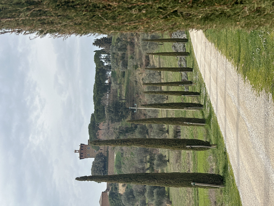 An outdoor scene in Pienza, Italy, depicts a rural landscape under an overcast sky