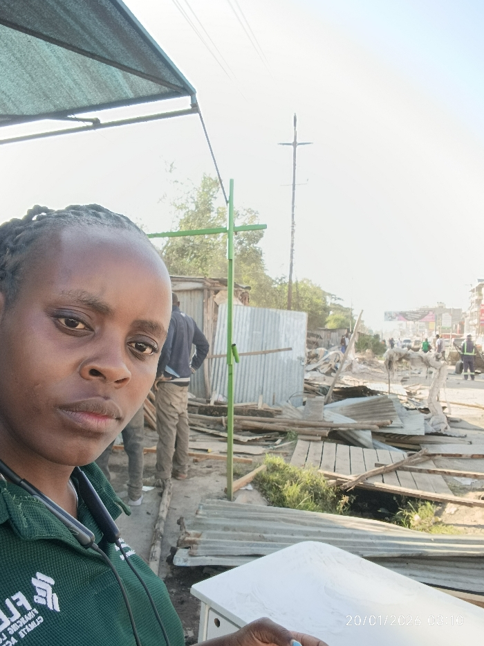A woman in a green uniform takes a selfie amidst debris. Scraps of metal sheeting and wood litter the ground. In the background, blurred figures move along a dusty road. An overhead shelter and utility pole add to the chaotic scene. A white surface occupies the bottom right corner. The date "20/01/2026" is stamped in the lower right corner.