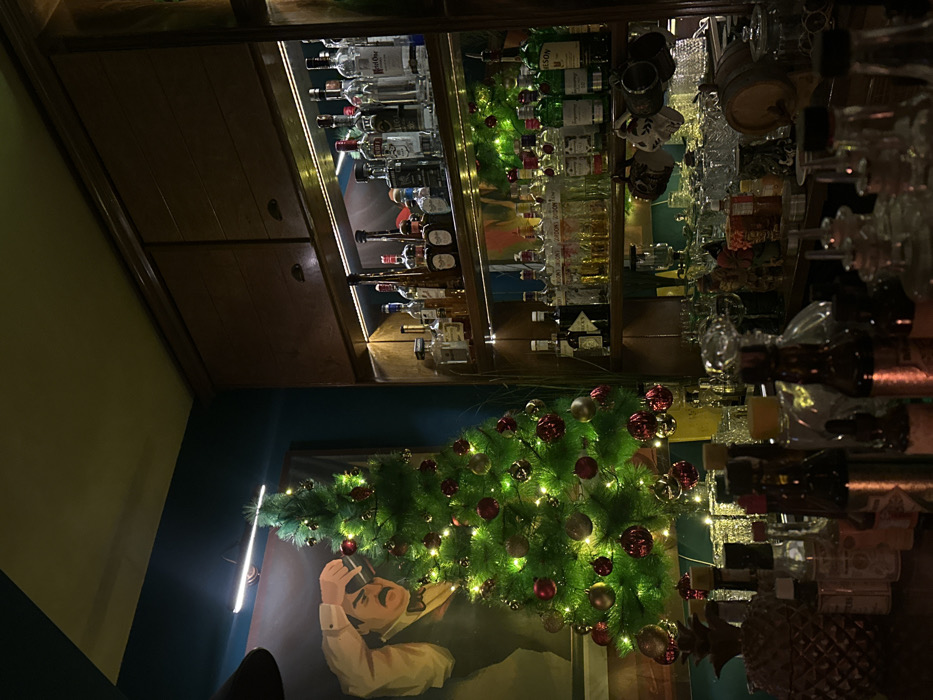 A low-angle shot shows a bar cabinet stocked with various liquor bottles and glassware. A Christmas tree decorated with lights and red and gold ornaments is mounted on a wall above a painting of a man in a white shirt and jacket, smoking a cigarette. The walls are painted in a teal color. The lighting is warm, highlighting the bottles and decorations. The image is rotated clockwise.