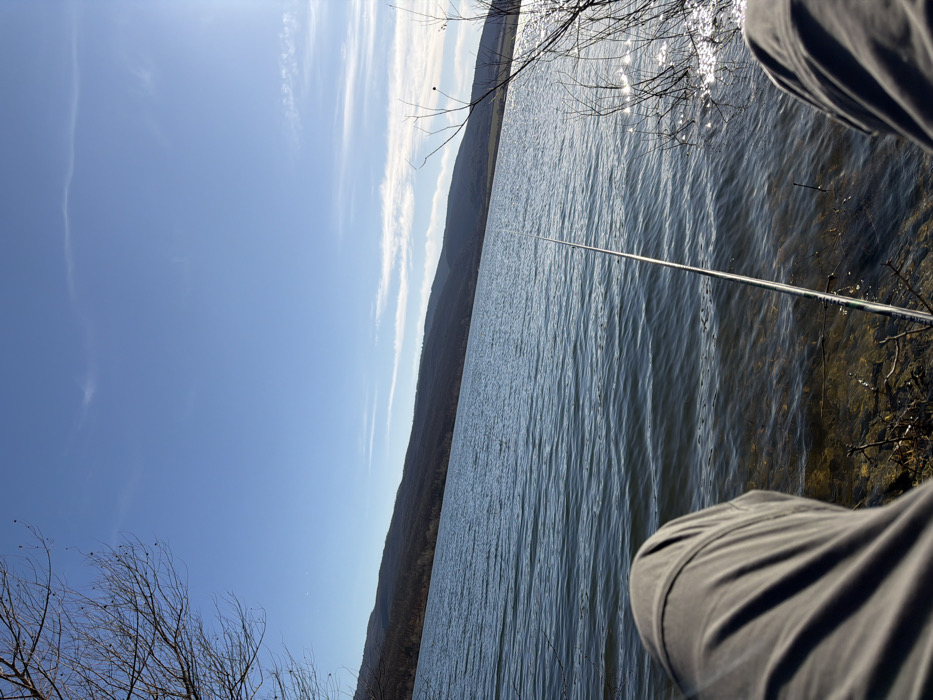 The image captures a first-person perspective of an individual seated at the edge of the Ognyanovo Reservoir, near the city of Ognyanovo, Bulgaria, engaged in fishing. The lower third of the frame shows the person's knees and thighs, clad in grey trousers, positioned above a dry, rocky shoreline with sparse vegetation. A grey fishing rod extends from the lower center diagonally into the rippled water of the reservoir. Across the expanse of water, a dark, forested mountain range or hillside stretches horizontally. The upper half of the image features a clear, bright blue sky with faint, wispy white clouds. Bare tree branches are visible against the sky on the far left and along the shoreline on the far right, where sunlight reflects intensely off the water's surface.