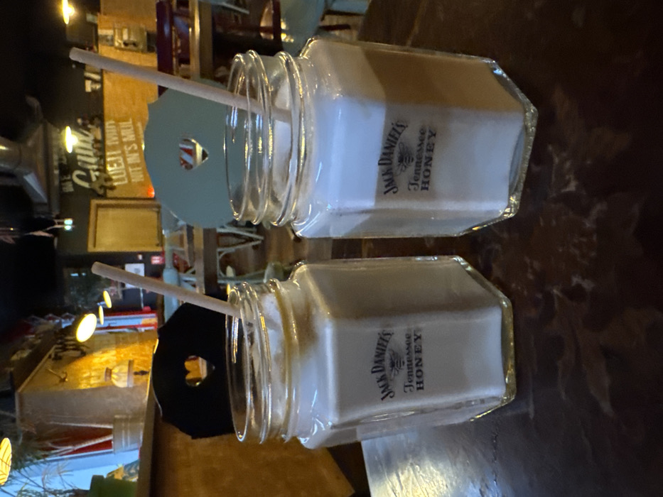 Two square glass jars, labeled "Jack Daniel's Tennessee HONEY," sit side-by-side on a dark surface. Both contain a milky white liquid. Straws protrude from the tops. The jar in the background has a light blue lid with a heart-shaped cutout. The foreground jar has a black lid, also with a heart cutout. The background shows a bar or restaurant setting with various decorations.