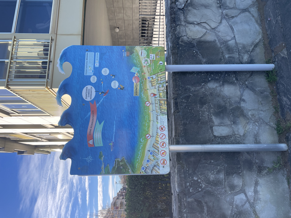 An outdoor informational sign, shaped like ocean waves, stands prominently in a city environment in Zarautz, Spain