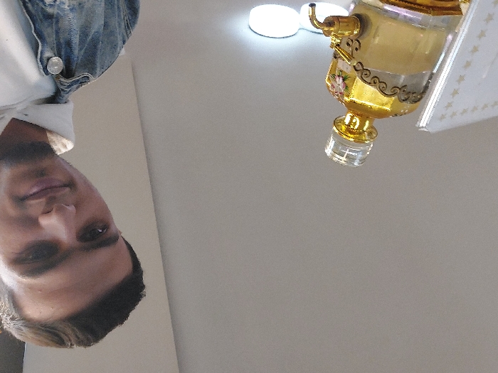 A man with short, dark hair, fair skin, and visible stubble looks up at the camera, wearing a denim jacket and white shirt. Above him, a golden samovar-like object with floral details is positioned near a white ceiling light and a decorative white panel with star patterns. The background is predominantly a plain, light gray surface.