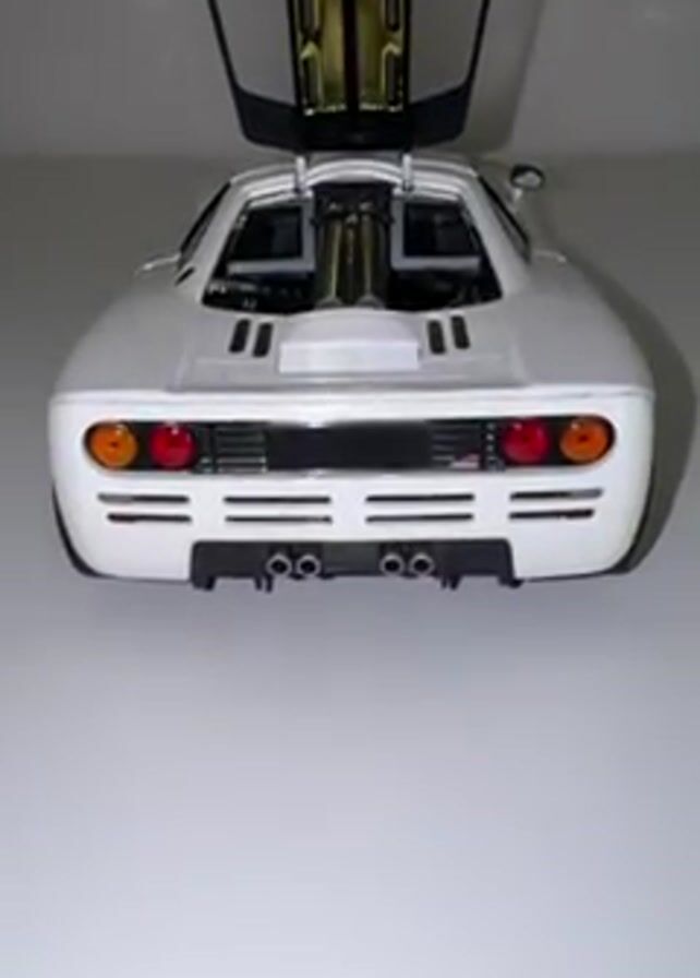 static, eye-level shot of a white McLaren F1 model car. The car's rear is facing the viewer, with its engine cover open and raised. The engine compartment is visible with two silver cylinders, and gold detailing is visible inside the open engine cover. The car's rear lights are visible, along with four exhaust pipes. The car sits on a white surface, presumably a table or countertop. The lighting is diffused.