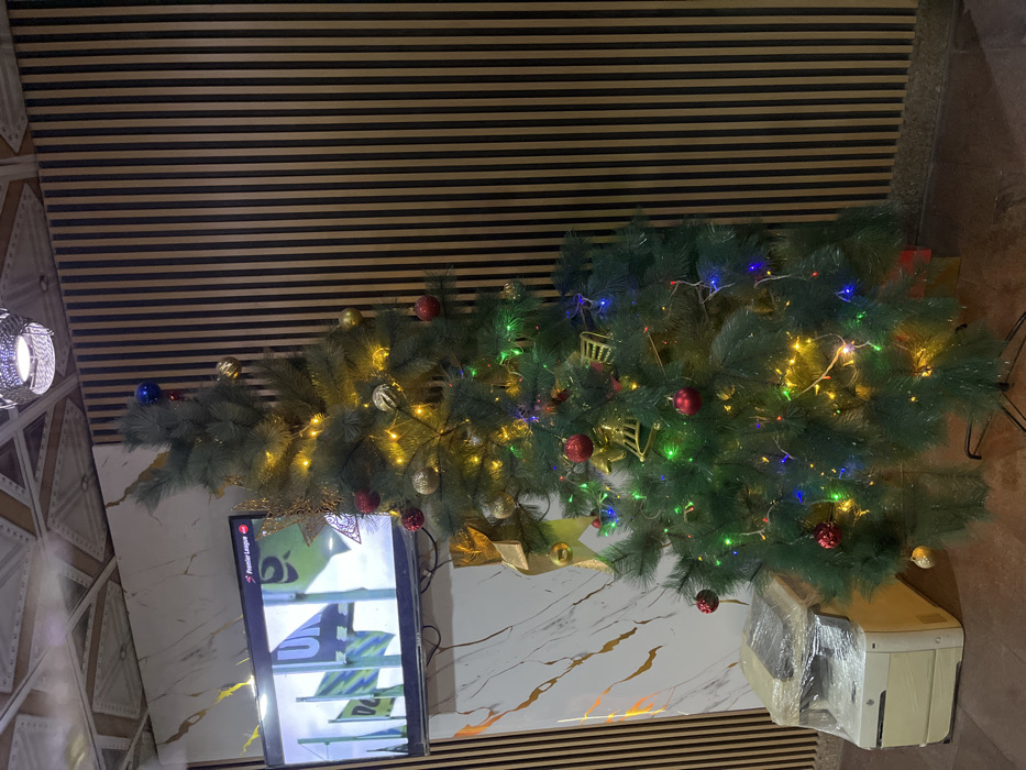 The scene depicts an indoor area within Sabon Gari East, Nigeria. A green artificial Christmas tree, adorned with multi-colored string lights (yellow, red, green, blue), red and gold spherical ornaments, gold bells, and a large gold star topper, stands prominently on a black metal base in the center-right. To the left of the tree, a flat-screen television is mounted on a wall featuring a white marble-like pattern with gold veining. The television screen displays a "Premier League" broadcast, showing multiple green and yellow flags. Below the television, a light-colored office copier/printer is observed wrapped in clear plastic. The wall extending to the right of the Christmas tree consists of vertical dark and light brown stripes. The ceiling above features patterned panels, and a silver-toned, mesh-like light fixture is visible in the upper right quadrant. The floor is a reddish-brown, possibly tiled surface. No individuals are present.