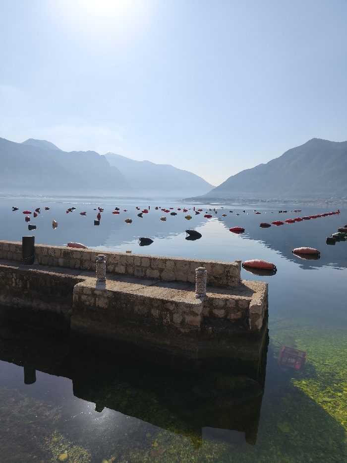 The image displays a clear waterscape in Dražin Vrt, Montenegro, specifically within the Bay of Kotor. A low-lying stone and concrete pier or seawall occupies the foreground, extending from the left towards the right. The structure features a rough, light brown stone facade and a flat concrete surface. Two light-colored, cylindrical pillars are visible on the pier's surface, with a darker, larger cylindrical bollard positioned at its leftmost edge. The water immediately surrounding the pier is clear and calm, revealing a light green, pebble-strewn seabed. A red plastic crate is submerged and visible beneath the water's surface near the pier's corner on the right. Numerous buoys or floats are scattered across the water's surface, extending into the mid-ground and distant left. These objects are predominantly red and black, with some yellow, varying in shape from elongated oval to more irregular forms. Some are arranged in distinct linear patterns. In the background, multiple layers of mountains rise directly from the water, displaying a blue-gray hue and increasing haze with distance. Patches of white, consistent with snow, are visible on some of the more distant peaks. The sky above is clear and light blue, with a bright light source, likely the sun, positioned in the upper left quadrant, casting a prominent reflection on the water near the pier. No individuals are present in the scene.
