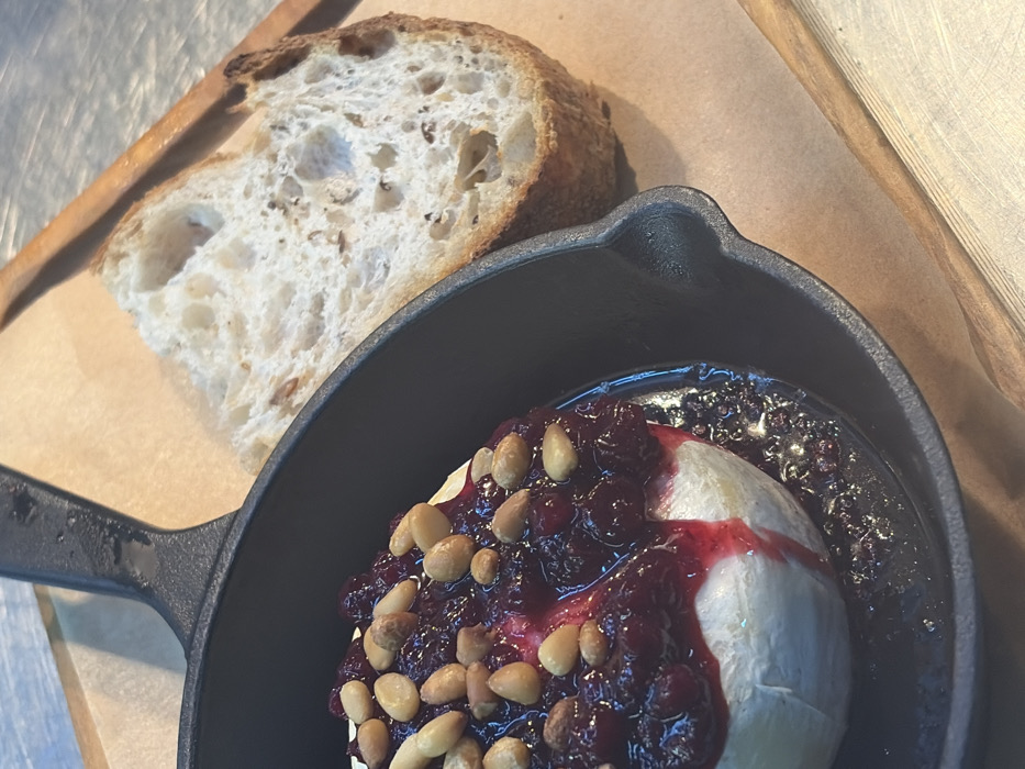 A still-life close-up image depicts a culinary presentation on a light-colored wooden surface, which rests on a lighter, reflective background. The central subject is a round, white cheese, consistent with baked brie, contained within a black cast iron skillet featuring a handle on the upper left. The cheese is topped with a dark red berry compote or sauce, partially pooled at the skillet's base, and generously garnished with pale yellow pine nuts. To the right of the skillet, a thick slice of rustic white bread, characterized by an open crumb and a light crust, is positioned. Both the skillet and the bread are placed on a sheet of light brown parchment paper. No individuals or active interactions are visible within the frame. This scene is identified as being located in the city of Rostov-on-Don, Russia.