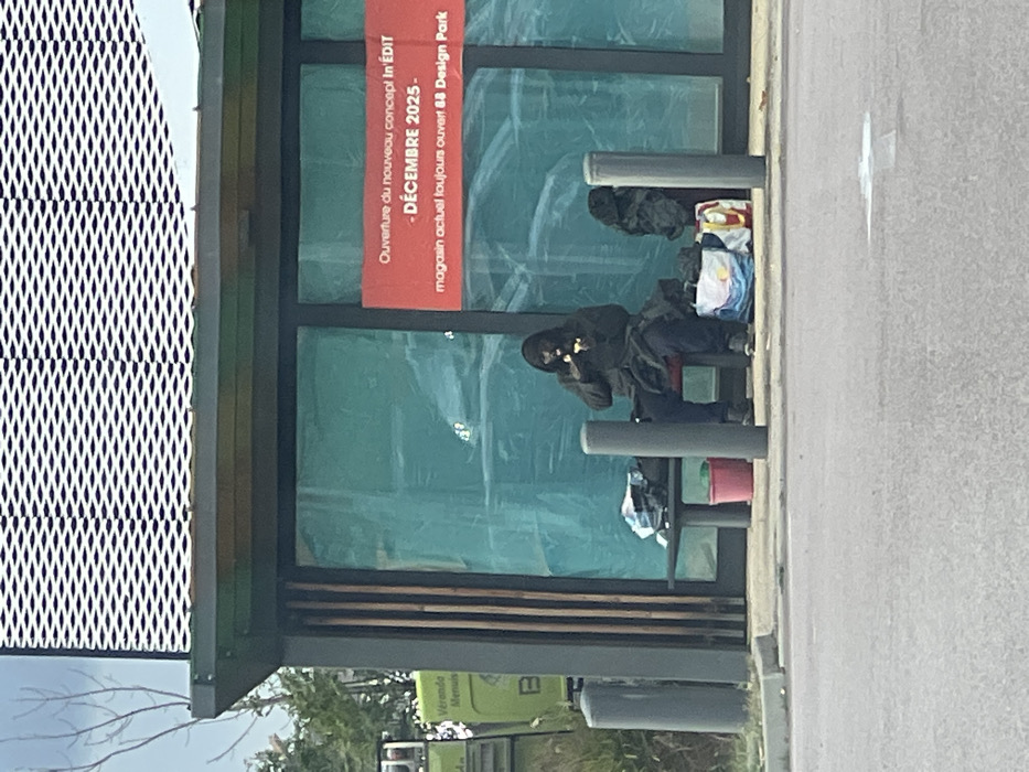 The image displays an outdoor scene at the B&B Design Park in Mondeville, France. A single individual is seated on a dark gray bench with a red cushion, positioned directly in front of a commercial building. The building features large glass windows, which are covered internally with a translucent green plastic sheeting, indicating renovation or construction. A red banner sign is affixed to the windows, displaying text in French: "Ouverture du nouveau concept In'EDIT - DÉCEMBRE 2025 - magasin actuel toujours ouvert à B&B Design Park." The upper facade of the building is clad with white, perforated metal panels. The seated individual is dressed in dark clothing, including a dark hooded jacket or coat with the hood pulled over their head, partially obscuring their face. They are engaged in eating a yellow-white food item, held with both hands near their mouth. Personal belongings are distributed around the person: a black bag and a folded white item on the bench to their left, a red plastic bucket on the ground adjacent to the bench, and a dark crumpled bag along with a light-colored reusable shopping bag on the ground to their right. Two gray bollards are positioned in front of the bench area, separating it from an asphalt road. To the far left, green foliage and a portion of a light green utility vehicle are visible. The sky overhead appears overcast.