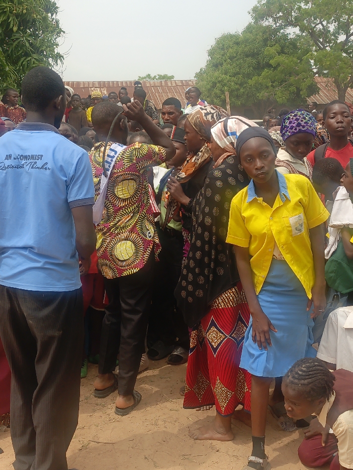 The scene depicts an outdoor gathering in Akwanga, Nigeria, featuring a dense crowd of approximately twenty-five individuals, including adults and children, standing on light brown, uneven dirt ground