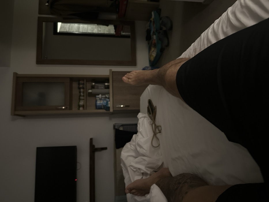 The image depicts an interior scene, likely a hotel room or guesthouse, in Krasnovo, Bulgaria, presented from a first-person perspective looking down a person's body. The person is lying supine on a white bed, with their bare legs and feet extended towards the foreground. The left leg displays extensive dark tattooing from the thigh down. The right leg is clad in black shorts or underwear. White crumpled bedding is visible around the person's torso and legs. A light brown, coiled rope or string is on the bed between the person's legs, next to a small, dark object. In the background, against a light-colored wall, a black flat-screen television is mounted on the left, displaying a small red indicator light. A narrow wooden shelf is installed beneath the TV. To the right of the TV, a tall, light brown wooden cabinet unit stands. The top section features a cabinet with a frosted glass door and a silver handle. Below it, an open shelf holds several small containers, a silver thermal flask, and other items. A closed cabinet with a silver handle forms the base of the unit. Further to the right, a large rectangular mirror with a wooden frame reflects a dimly lit doorway or another section of the room. Adjacent to the mirror, a dark brown jacket or coat hangs on a hook or coat rack. On the floor below the mirror and coat, a light blue, open suitcase or bag is visible, surrounded by several pairs of shoes, including dark gray and black footwear. The overall lighting is dim, suggesting evening or low-light conditions.