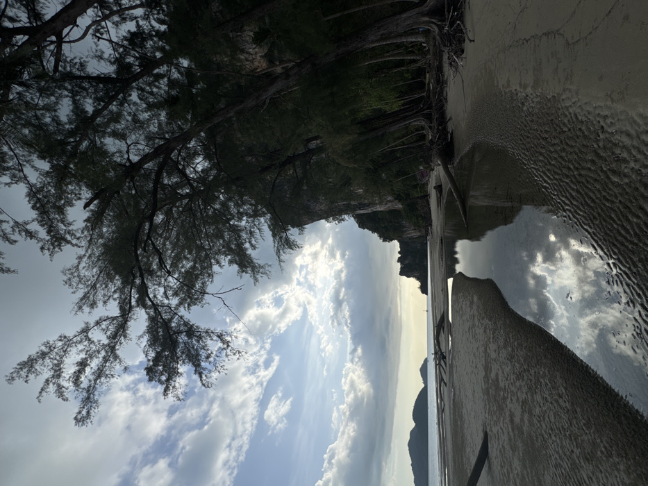 The image displays a coastal landscape at an unidentified location in the city of Unknown, Unknown. The foreground features a wide sandy beach with distinct ripple patterns. A winding, shallow water inlet traverses the beach, prominently reflecting the overcast sky with its white and grey cloud formations. Several dark, gnarled pieces of driftwood lie on the sand and within the water. To the right, a dense stand of tall, dark, slender trees, possibly pines, rises directly from the beach, their exposed root systems visible. These trees are silhouetted against the sky and grow at the base of sheer, towering limestone cliffs that extend into the mid-ground, showing visible rock stratification and sparse vegetation. The mid-ground to the left transitions from the beach to open water, where multiple dark, mountainous landmasses or islands are visible on the horizon. A small, solitary white object, possibly a buoy or a distant boat, is present on the water surface near the horizon line. The sky above is partially covered by scattered cumulus clouds, with brighter patches of light visible. No individuals or discernible activities are present in the scene.