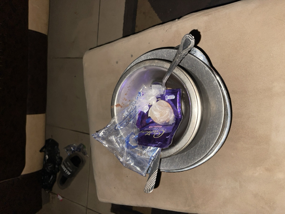 An overhead shot reveals a silver bowl atop a beige surface. Inside, a crumpled plastic wrapper and an open Cadbury hot chocolate sachet with a partially dissolved disc sit amidst remnants of the drink. A silver spoon rests across the bowl. To the side, out of focus, are two pairs of slippers on a tiled floor near a brown and beige striped object, possibly a piece of furniture.