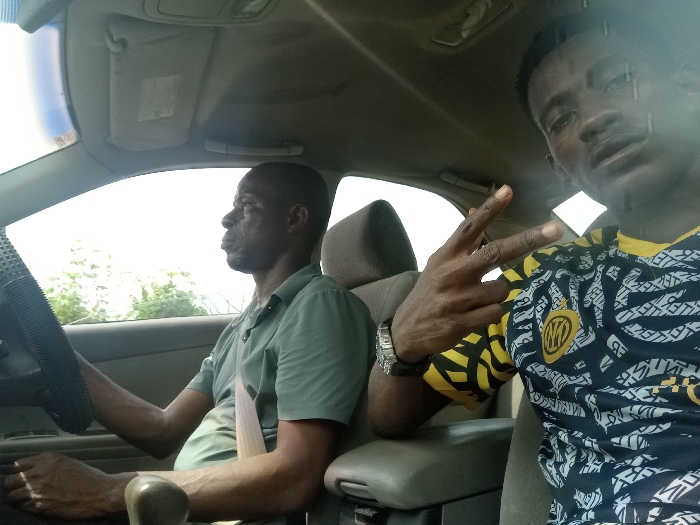 Inside a car, two dark-skinned men are visible. The driver, wearing a green shirt, focuses on the road. The passenger, in a patterned black and yellow shirt, flashes a peace sign towards the camera. The car's interior features beige seats and a dark steering wheel. Outside, a bright, overcast sky is visible through the windshield.