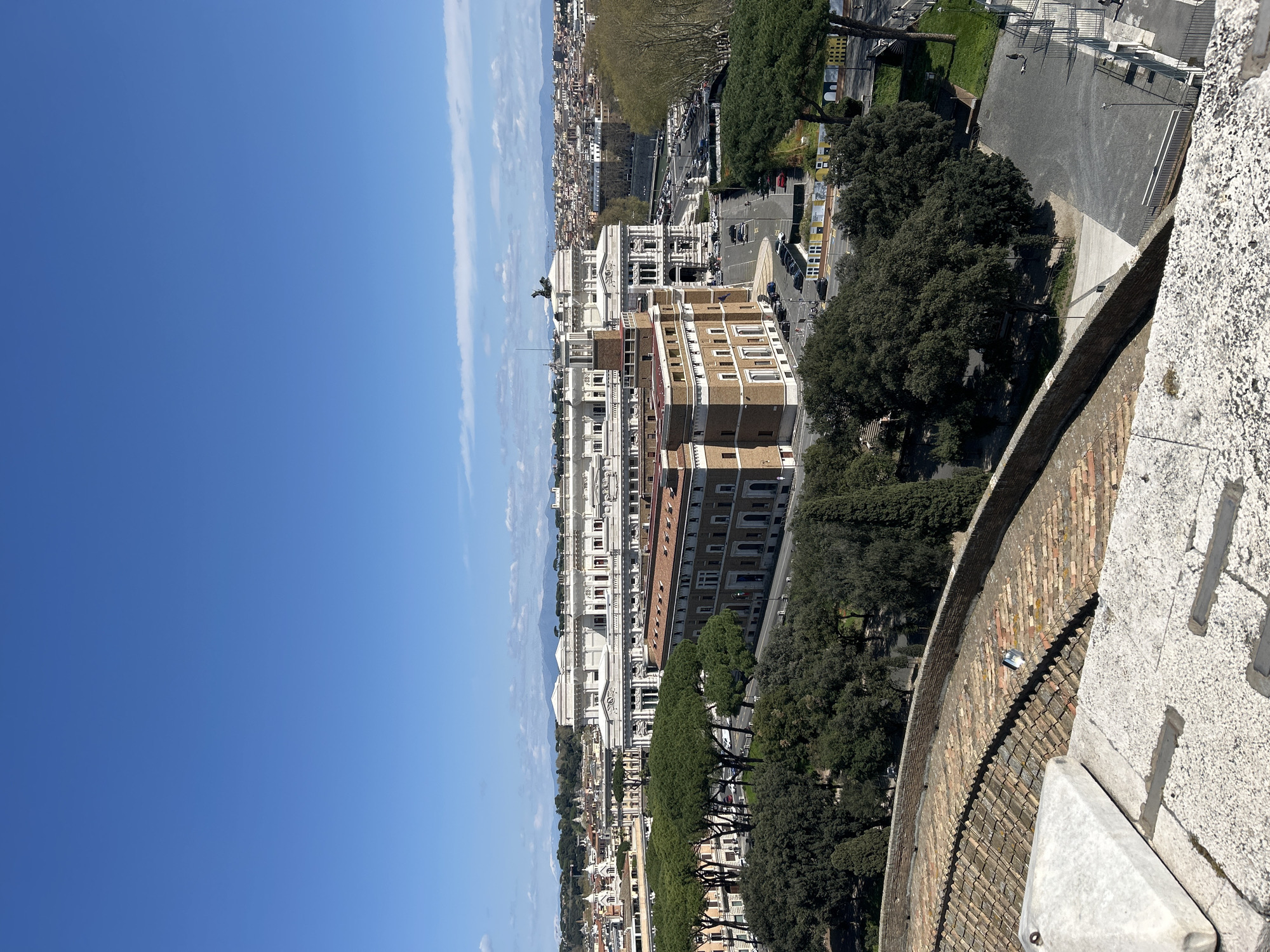 An elevated panoramic photograph captures a section of Rome, Italy, looking southeast from an elevated structure, likely Castel Sant'Angelo