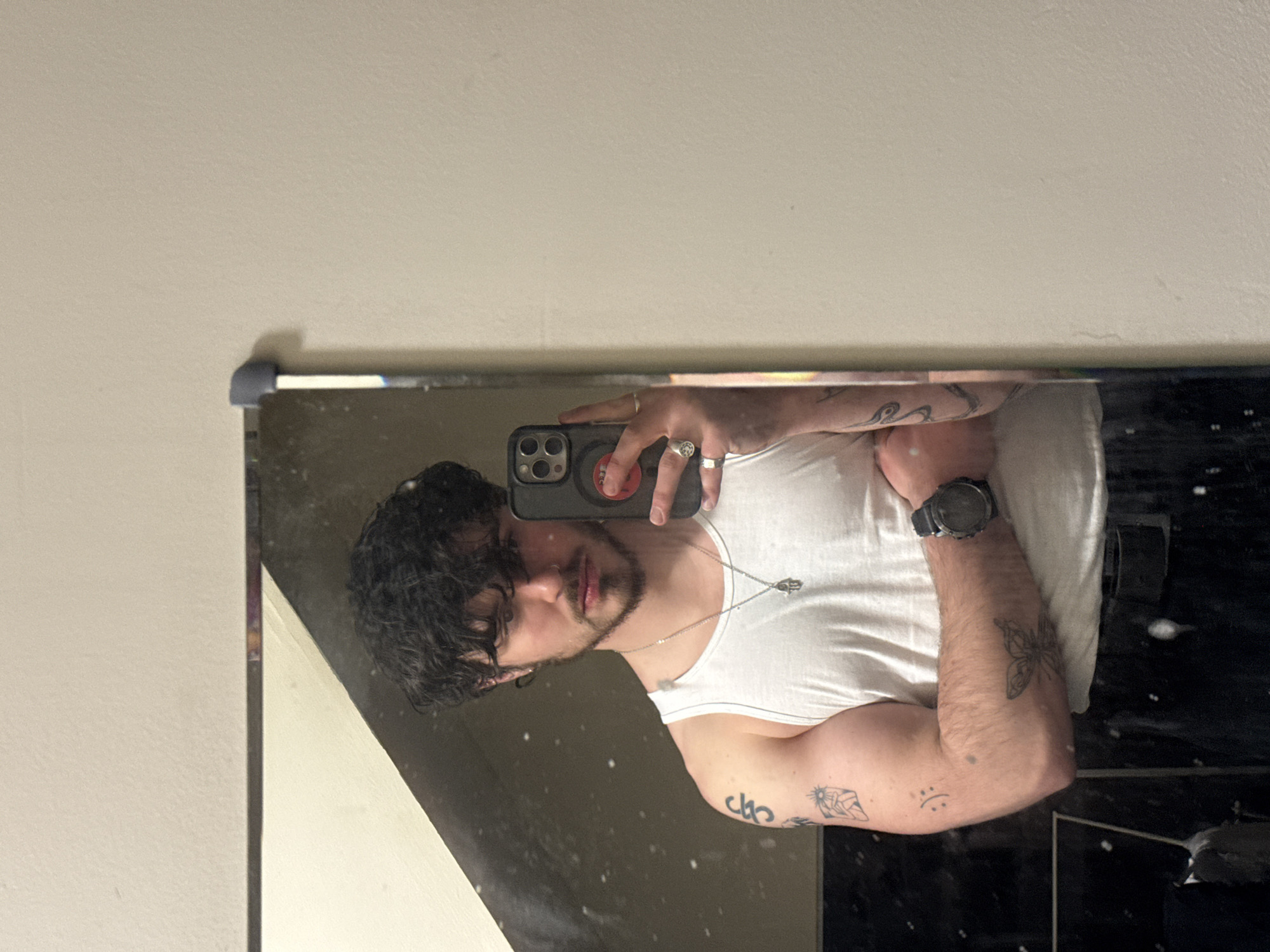 A man with curly dark hair, a beard, and several tattoos is taking a selfie in a mirror. He is wearing a white tank top, a watch, and a necklace. He has rings on his fingers and is holding a phone with a black case. The background shows a plain wall and a glimpse of a black surface. The location is unknown.