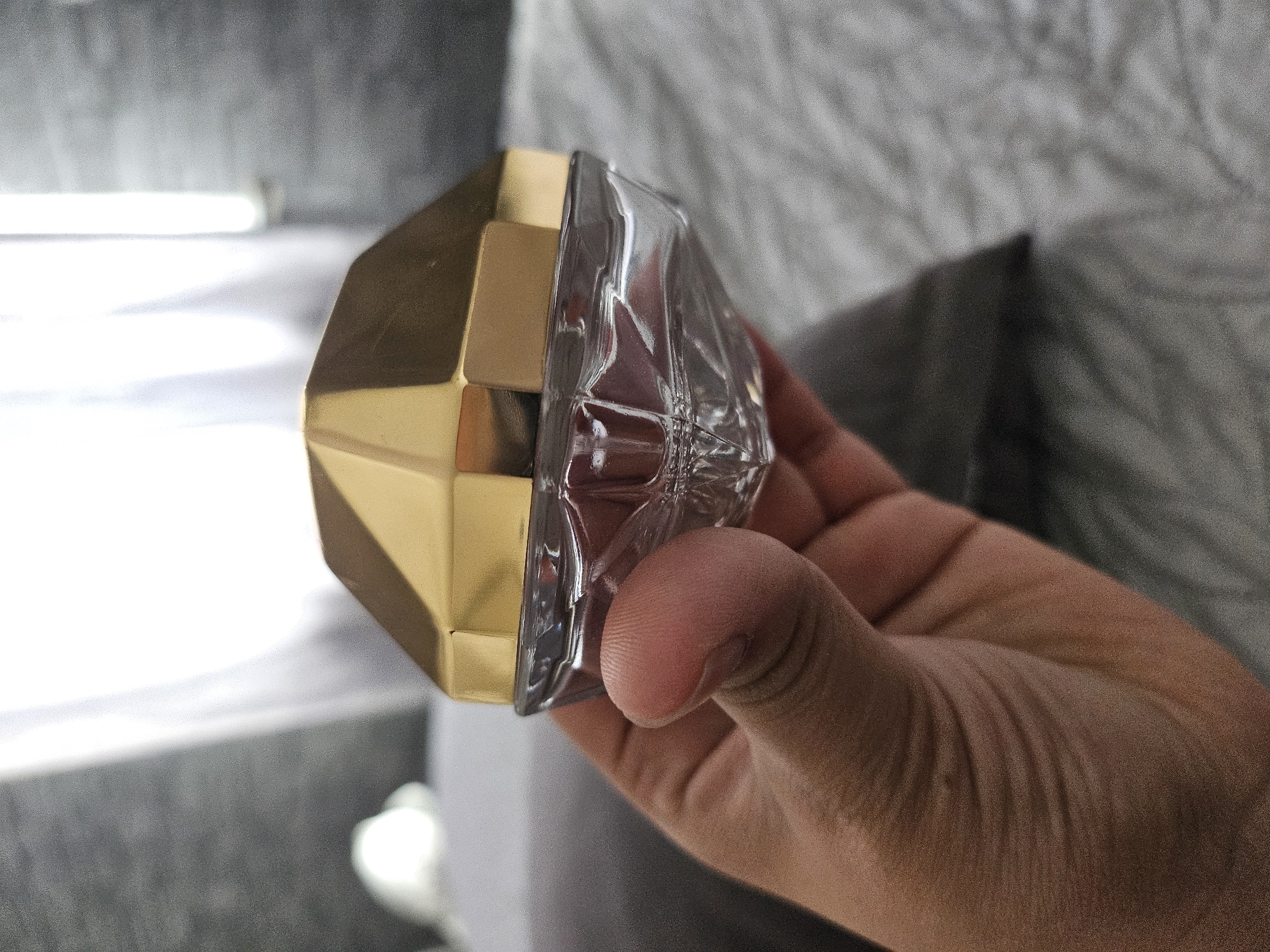 The image depicts an indoor scene; no identifiable landmarks or specific features correspond to the city of Trier, Germany. A human hand, with a medium skin tone, occupies the lower-left and central portions of the frame. The hand is holding a faceted, clear glass bottle. The thumb is prominent, displaying discernible fingerprints and skin creases. The bottle features a distinctive gold-colored, geometrically shaped cap composed of interlocking panels. The glass body of the bottle contains a dark, possibly reddish-brown, liquid. The background is intentionally blurred. To the left, a dark grey, textured surface, likely a wall, is visible. To the right, a brightly illuminated white area suggests a window with sheer or light-colored curtains, serving as a primary light source. Below and to the right of the held object, a light grey, patterned fabric surface, consistent with a bedspread or blanket, exhibits folds and texture. The overall environment suggests a domestic setting, possibly a bedroom.