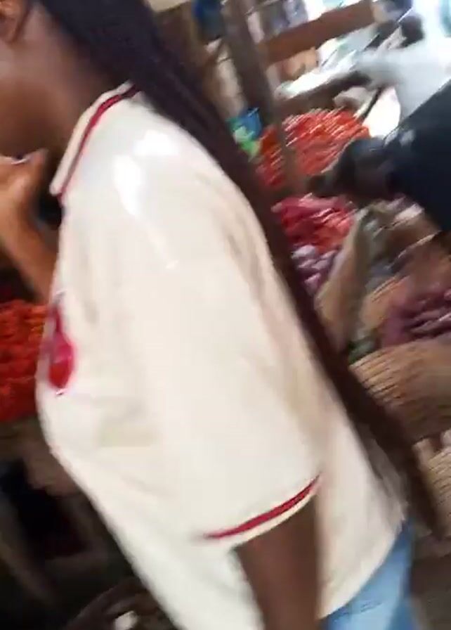 n open-air market. Several people are browsing and selecting produce. There are baskets of green avocados, red tomatoes, and other items on display. A woman with long braids, wearing a white t-shirt and blue shorts, examines something in her hand. Other individuals are visible in the background, and the environment appears to be bustling with activity. The lighting suggests it is daytime.