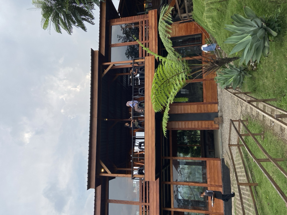 This image depicts a multi-level wooden structure, likely a cafe or restaurant, situated on a verdant hillside in Tamiajeng, Indonesia