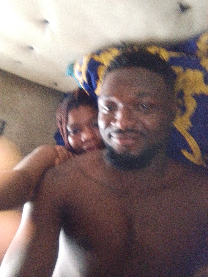 A selfie shows a shirtless Black man with a beard smiling at the camera. Behind him is a woman partially visible, with her arm resting on his shoulder. They appear to be in bed, with a patterned blue and yellow pillow or headboard visible behind them. The background includes a blurry ceiling and a wall, suggesting an indoor setting. The image quality is somewhat grainy.