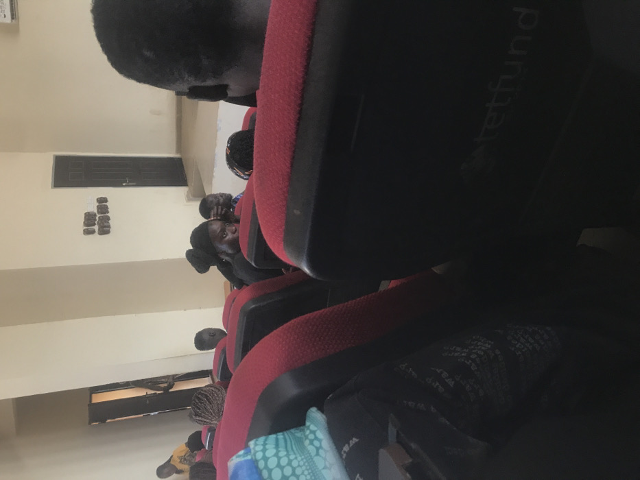 The scene depicts the interior of an auditorium or lecture hall, viewed from the rear, within a tertiary education facility in Agwala, Nigeria. Multiple rows of fixed seating, upholstered in red fabric with black plastic backs, are present. The back of a seat in the immediate foreground prominently features the embossed logo "tetfund." Several individuals are seated, primarily visible from behind. In the mid-ground, a person with dark skin and a dark head covering is observed looking directly towards the camera. To their right, another individual partially obscures their face with their hands. In the left background, a person with braided hair is visible among other seated individuals. The walls are a light cream color. In the far background, two dark wooden doors are visible; one on the left is ajar, revealing a person in a yellow top, while the other on the right is closed. A series of dark, decorative elements are mounted on the wall between the two doors. A flight of stairs is partially visible to the right of the closed door. The lighting is bright and even.