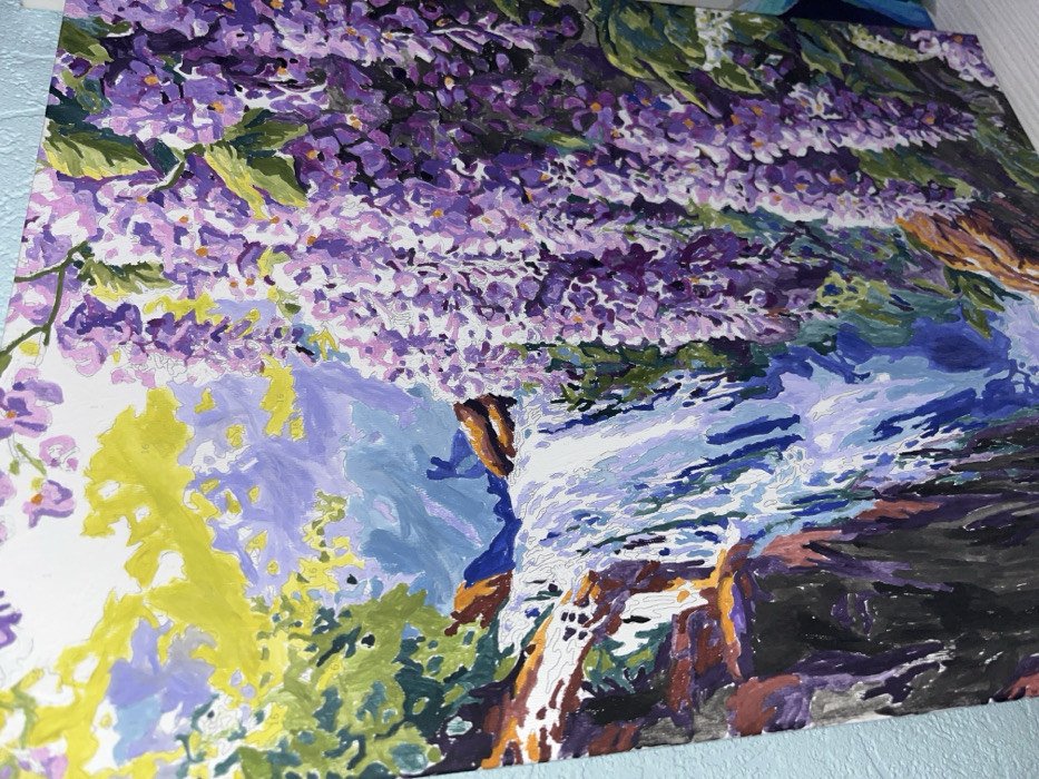 This image displays a photograph of a partially completed paint-by-numbers canvas, depicting a vibrant natural landscape scene. The canvas is situated within a room in the city of Izhevsk, Russia. The artwork, viewed from a slightly elevated and tilted perspective, prominently features a dense cascade of purple wisteria flowers and green foliage occupying the right half of the canvas. These floral elements are painted in various shades of lavender, violet, and green. The left and central portions of the painting depict a waterfall rendered in blues and whites, rushing over brown and dark purple rock formations. Green and bright yellow foliage, possibly indicative of sunlight, frames the upper left. Numerous areas across the canvas remain unpainted, showing white canvas with visible numerical outlines characteristic of a paint-by-numbers kit (e.g., the number "16" is discernible in several unpainted sections). The immediate environment of the painting includes a light blue textured surface visible in the bottom-left corner, and a white, flat surface in the bottom-right corner, on which the canvas presumably rests. A dark blue object is partially visible along the far right edge of the frame. No individuals are present in the scene. The depicted landscape within the painting is a generic natural environment and does not represent a specific identifiable location within Izhevsk.