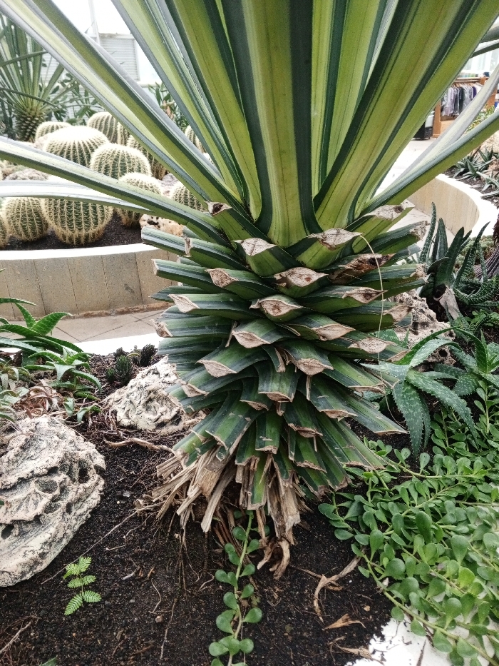 A close-up shows a plant with long, striped green and light yellow leaves emerging from a thick, layered stalk. The stalk is composed of tiered, shorter green leaves with brown tips. The base of the plant has exposed roots or dead leaves. The plant is surrounded by dark soil, small rocks, and other greenery, including aloe plants and trailing vines. In the background, cacti are visible in a raised garden bed.