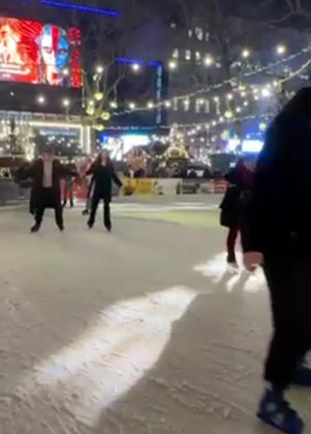 n outdoor ice rink at night. Several people are ice skating, some in pairs and some individually. Most of the skaters are wearing dark colored jackets or coats. Decorations, including hanging lights, Christmas trees, and a large screen displaying an image of an Avatar character, are around the rink. There are people watching the skaters from the sides of the rink. The ice appears to be white, and there are patches of light from the overhead lights on the ice.