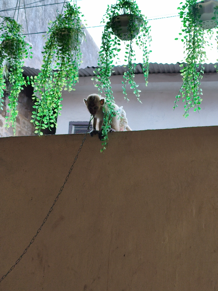 A juvenile macaque monkey is positioned on a light brown concrete wall in Bogor, Indonesia. The monkey, predominantly light tan with a tattered white cloth object on its back, is secured by a metal chain that extends from its upper body downwards into the foreground. Its head is lowered, and its forepaws are directed towards the chain or an object at its base. Above the wall, a series of white hanging planters contain cascading artificial green vines that partially frame the scene. In the background, a building with a corrugated metal roof, a white wall, and a dark rectangular window is visible beneath an overcast sky.