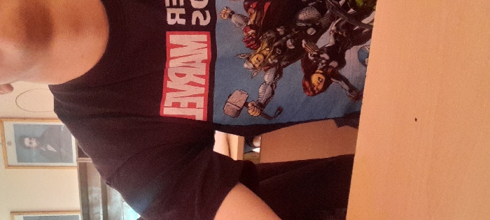 The image depicts an indoor scene in Karnobat, Bulgaria. The foreground features a light-colored desk surface with a small dark speck. Behind the desk, the upper torso and head of an individual are partially visible, specifically their neck, lower jawline, and left shoulder. The person is wearing a black t-shirt. The shirt bears a mirrored "MARVEL" logo in red and white lettering, positioned across the chest area. Below the logo, a blue graphic portrays Marvel comic characters, including Thor wielding Mjolnir and Black Widow. The background consists of a light-colored wall where a framed portrait is mounted. This portrait depicts a bearded man in dark clothing, set within a light wooden frame featuring a crest at its apex. A partial view of another framed item is visible to the left of the primary portrait. Below the framed items, a light-colored shelf or ledge is present. A faint, white, oval-shaped mark is visible on the wall to the right of the main portrait. The individual's actions and interactions are not discernible.
