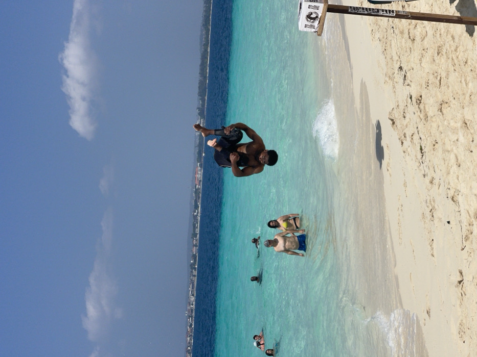 The image captures a sunny daytime scene on a sandy beach in Zanzibar, Tanzania, with a coastal city visible in the distant background across the water. A young Black male is depicted in mid-air, performing a backflip or somersault over the shallow, turquoise ocean water, with a splash occurring beneath him. He wears dark shorts. To the left, a White male in blue swim trunks and a White female in a yellow bikini stand waist-deep in the water. Further left and deeper in the water, approximately four additional individuals are partially visible. The ocean water transitions from light turquoise near the shore to a deeper blue further out. The distant background features a developed cityscape along the horizon under a clear blue sky with a few scattered white clouds. The foreground consists of light-colored sand, and a wooden post with a white box is partially visible on the far right of the sandy beach.