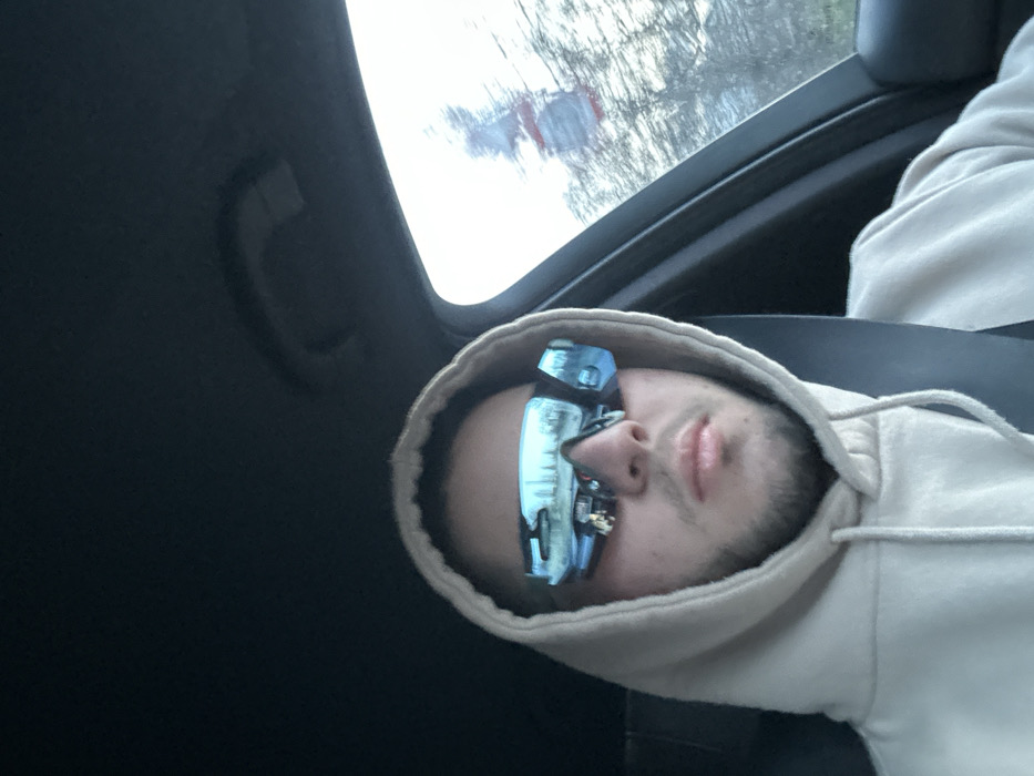 A male subject is depicted seated in the front passenger side of a vehicle, in what is identified as Yana, Bulgaria. He is wearing a light beige hooded sweatshirt with the hood pulled over his head, and a dark seatbelt is secured across his torso. Large, mirrored blue sports sunglasses obscure his eyes, reflecting a distorted view of an urban or industrial landscape containing buildings and bare trees. Through the vehicle's passenger window, out of focus, skeletal trees and a segment of a red and white striped pole or sign are visible against a bright, possibly overcast, sky. The vehicle's dark headliner and an overhead grab handle are discernible in the upper portion of the image.