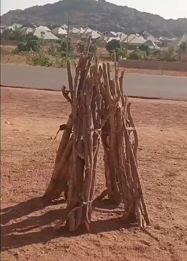 - "A stack of bundled tree limbs in the shape of a triangle sits on a reddish, sandy ground next to a paved road" by FM-5CO5o1, licensed under CC BY 4.0