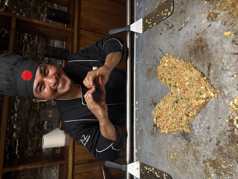 A smiling chef in a black uniform and hat with a red circle makes a heart shape with his hands. He stands beside a griddle where fried rice is shaped into a heart. Two metal spatulas rest on the griddle's edges. The background shows wooden paneling and a roll of paper towels. The chef's uniform has "JAZ HOTEL GROUP" embroidered on it.