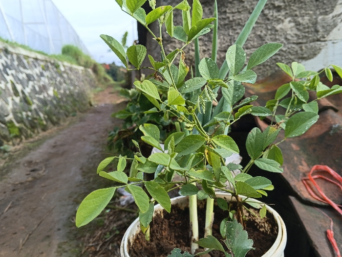 A potted plant with vibrant green leaves sits prominently in the foreground, complemented by green onions. A narrow dirt path stretches into the distance, bordered by a moss-covered stone wall and a wire mesh fence structure. The backdrop blends a mix of vegetation and structures. The pot contains dark soil and some support sticks for the plant. A piece of red plastic string rests near the edge of the photo.