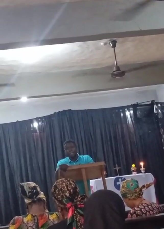 A man in a blue shirt stands behind a wooden podium giving a speech to a small congregation in what appears to be a church