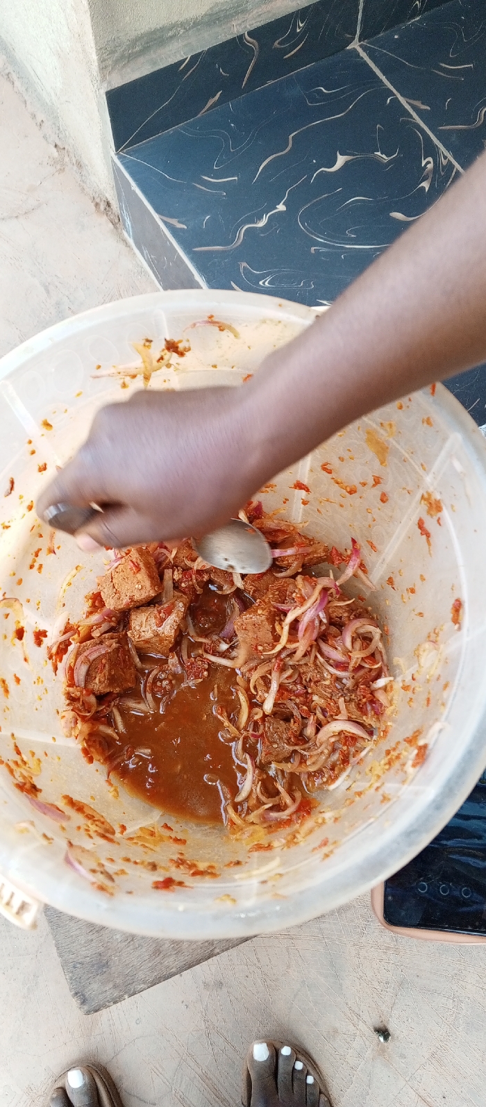 The image depicts an overhead view of a food preparation or serving scene in Kakau, Nigeria. A dark-skinned human hand is using a silver-colored spoon to interact with a clear, translucent plastic bowl containing a mixture of food items. The bowl holds several irregular, reddish-brown cuboid pieces, thinly sliced red onions, and a reddish, oily liquid or sauce pooling at the bottom. The interior sides of the bowl are splattered with reddish residue. In the background, a dark blue tiled wall with white wavy patterns is visible. Below the bowl, on a light-colored ground surface, a rectangular piece of dark wood or board is present. At the bottom of the frame, a pair of dark-skinned human feet with white-painted toenails are visible, wearing light brown open-toed sandals. A black smartphone with a visible screen crack is partially visible on the ground to the right of the bowl.