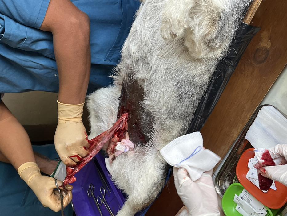 In Huejotzingo, Mexico, a gray and white mixed-breed dog lies supine on a black sheet covering a wooden table, undergoing an abdominal surgical procedure. A large, open incision on the dog's ventral abdomen reveals muscle and subcutaneous tissue, heavily saturated with dark red blood that also stains the surrounding fur. Three individuals are involved. A primary surgeon, wearing light blue scrubs and tan surgical gloves, uses a metal instrument to grasp and manipulate a long strip of reddish tissue, possibly muscle or fascia, extending from the surgical site. A second individual, wearing greenish-blue scrubs and tan gloves, is partially visible to the left, holding additional surgical instruments. A third person, wearing white surgical gloves, holds a clean, folded white gauze pad with a blue stitch visible to the lower left of the dog, while another blood-soaked gauze pad is held over an orange plastic medical dish. A purple tray containing various metal surgical instruments, including forceps and scissors, is positioned near the dog's head. A green plastic dish with individually packaged sterile items and a metal tray are also visible. Small, dark, irregular objects, possibly dried blood clots, are scattered on the dog's fur near the incision.