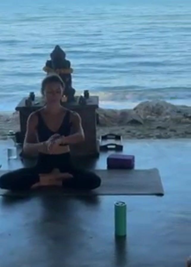 A video shows two women practicing yoga on a covered patio in front of a beach