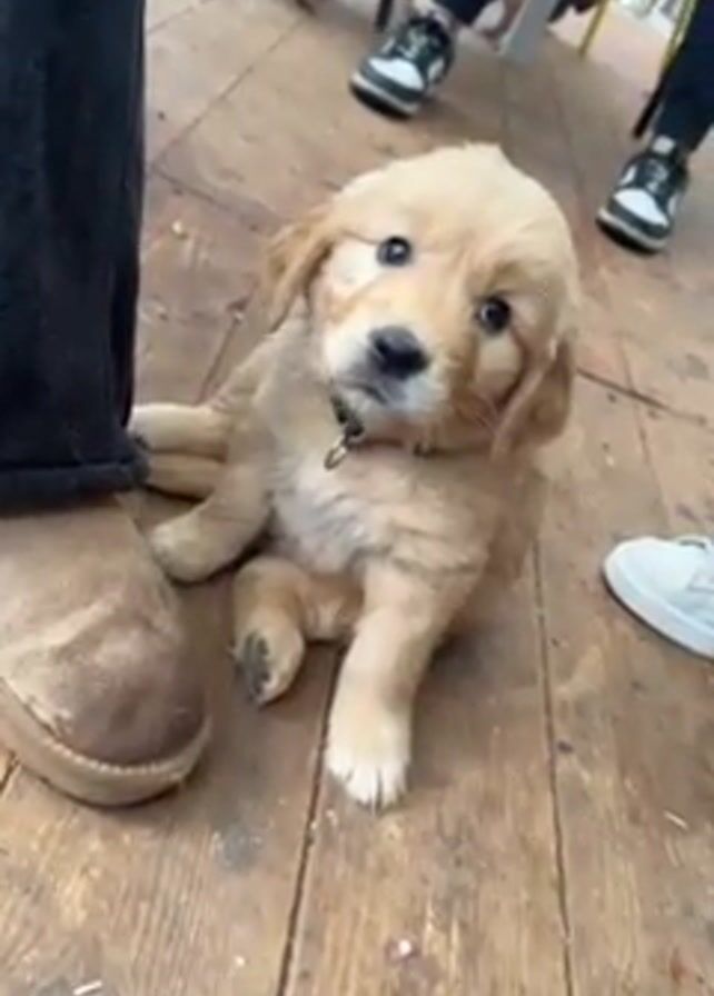 - "golden retriever puppy on a wooden deck at the feet of several people" by FM-Eqgh52, licensed under CC BY 4.0