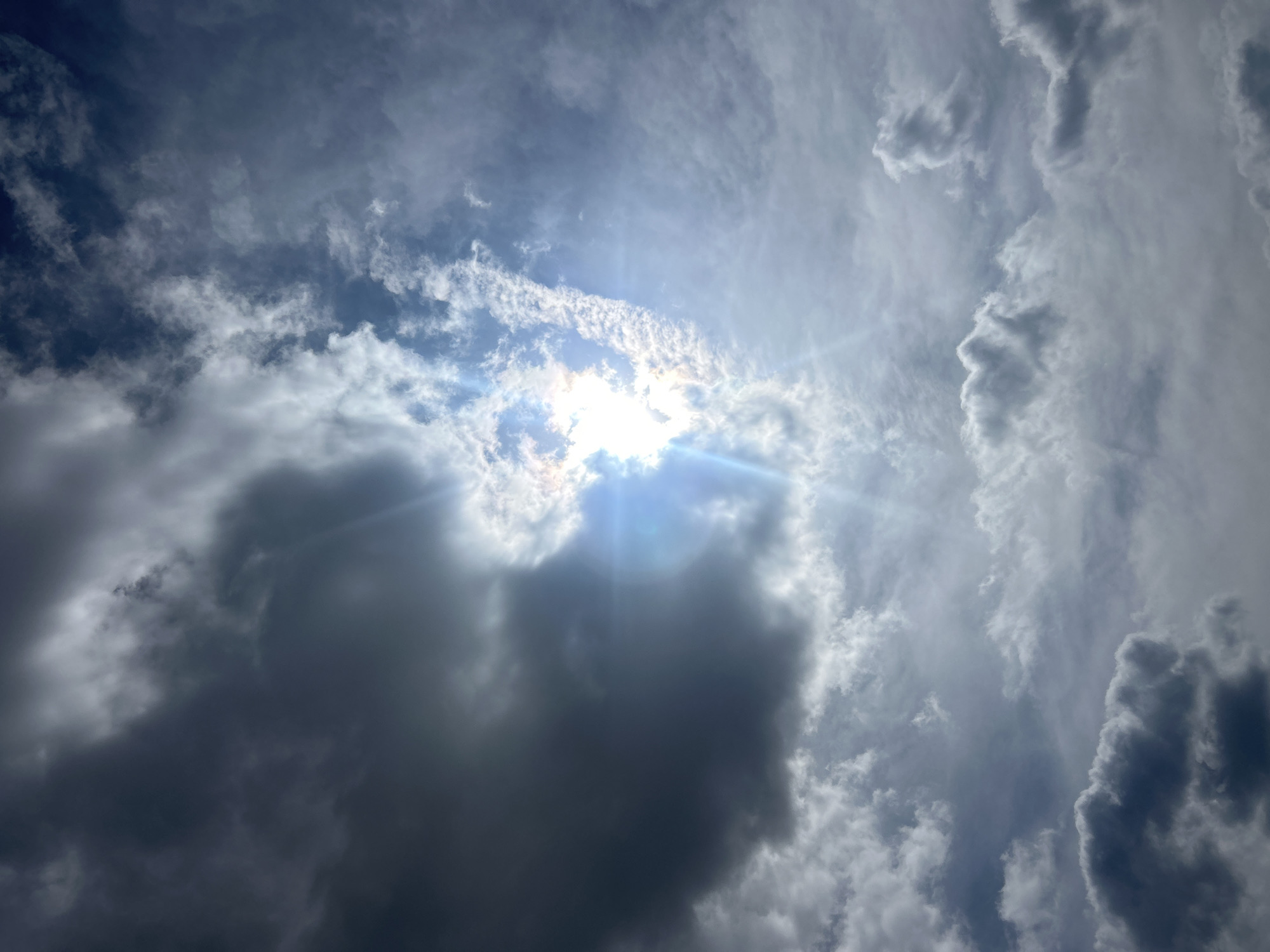 The image depicts a sky scene above Nepraznentsi, Bulgaria. The upper portion of the frame is dominated by a dense formation of dark grey stratus or cumulus clouds, extending from the upper left to the central left. A brilliant, intense sunburst is visible through a significant break in these clouds in the upper-left-center, casting strong, visible rays of light diagonally downwards and to the right. The immediate area around the sun is intensely bright, appearing white with a blue-white halo. The central and right portions of the sky feature lighter, more diffuse white and light grey clouds, possibly altocumulus or stratocumulus formations, with patches of visible blue sky interspersed between them. The lower part of the frame shows a mix of darker and lighter clouds. No people, man-made objects, or land features are visible within the frame. The scene captures a dynamic interaction of sunlight penetrating through a heavily clouded sky.