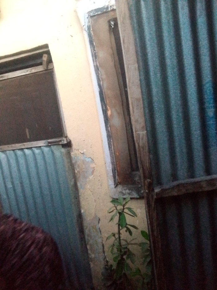 The scene depicts an exterior wall of a building in Bukuru, Nigeria, characterized by weathered construction materials. The wall is painted a faded light yellow-beige, showing extensive peeling paint and discoloration, particularly concentrated at the lower central portion. Two distinct openings are visible. On the left, a rectangular window-like opening features a dark, opaque upper section, possibly screened or glazed, secured by a horizontal latch mechanism. Below this, a section of corrugated metal, painted dark green-blue, forms the lower part of the opening. To the right, a vertical, recessed void with dark, worn framing, possibly wood, presents a uniformly dark interior. Adjacent to and partially overlapping the right opening, a large, vertically oriented corrugated metal panel, dark blue-green in color with prominent vertical ridges, is present. This panel appears to be part of a door or shutter, exhibiting a weathered wooden frame element on its left edge. At the base of the wall, between the two openings, a small, multi-leafed green plant grows directly from the ground. In the lower-left foreground, a blurry, reddish-brown textured object is partially visible, obscuring a portion of the left corrugated panel. No discernible human figures, specific actions, or interactions are clearly identifiable within the frame. The overall environment appears aged and utilitarian.