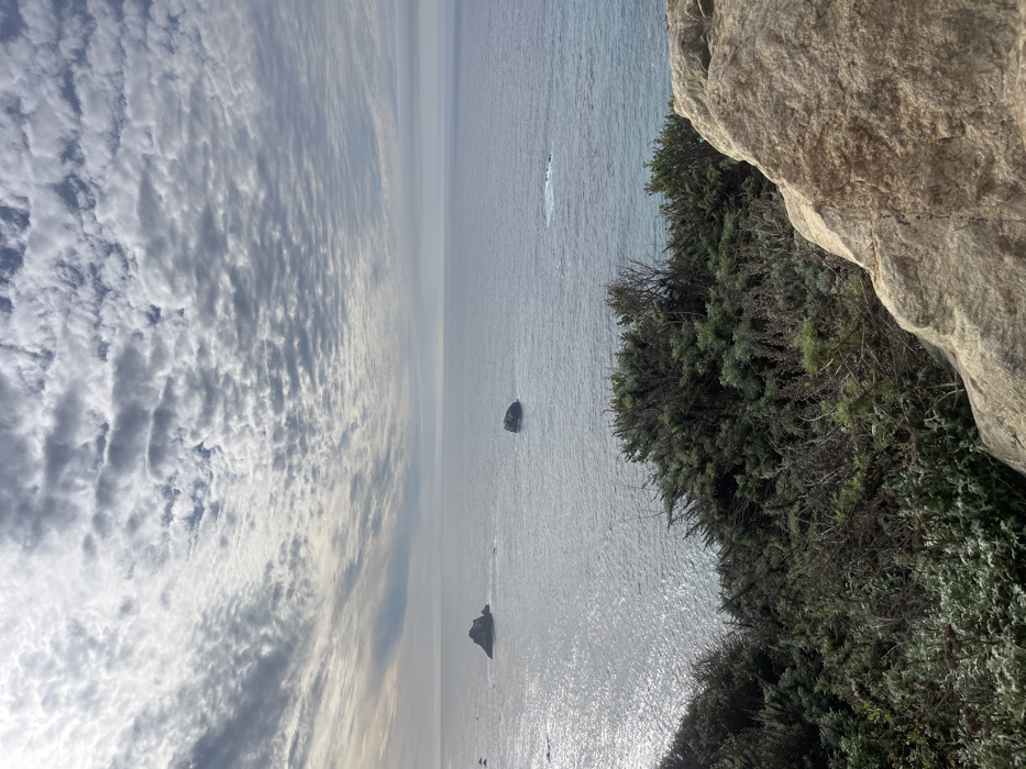 The image depicts a coastal scene with a striking juxtaposition of elements. A cloudy sky occupies the left, meeting a serene body of water where rocks protrude. The foreground features a rocky cliff covered in greenery, contrasting the sky. The water has a slightly shimmering surface, reflecting sunlight.
